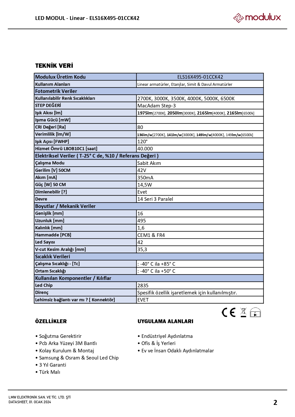ELS16X495-01CCK42 -30W – 350mA SABİT AKIM LED MODÜL & ÇUBUK LED